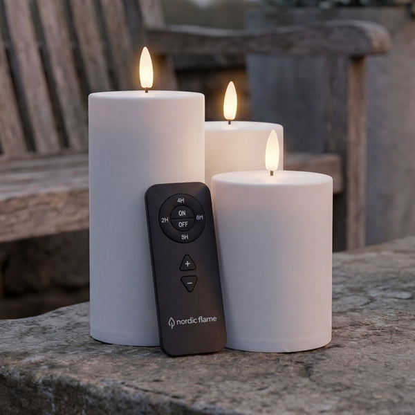 Creëer een prachtige, sfeervolle en onderhoudsvrije buitenverlichting met deze set van 3 exclusieve LED-stompkaarsen van Nordic Flame – ideaal voor balkon, terras, tuin of entree.